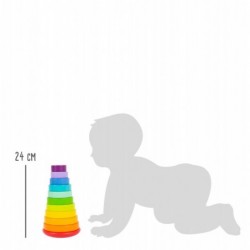 Virnastamine ja nokitsemine! See suur vikerkaarevärvides puidust virnastamistorn jätab mulje lisaülesandega: erineva suurusega puidust kettaid tuleb mitte ainult õiges järjekorras vardale lükata, vaid ka õigesse asendisse keerata, et ketaste vahed langeksid kokku varda väikeste tihvtide asendiga. See on keeruline ülesanne, mis treenib peenmotoorikat ja probleemide lahendamise oskusi! Ümar põhi võimaldab lõpetatud virnastamistornil lõbusa preemiana ringi liikuda. Tornide ladumisega mängimine ei paku lastele mitte ainult kauakestvat mängulusti, vaid aitab mänguliselt kaasa ka värvide, kujundite ja suuruste mõistmisele.