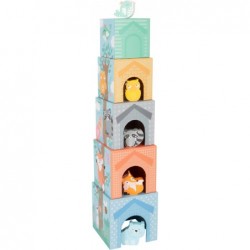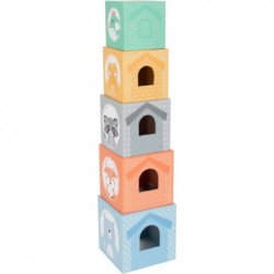 Trendikates värvides virnastamine! Kõik viis stabiilsest papist pastelsetes toonides virnastuskuubikut ja kokkusobivad puidust loomafiguurid ootavad vaid virnastamist ja määramist. Neljal kuubil on kujukeste peitmiseks ukse- ja aknaavad. Mängulised illustratsioonid annavad juhiseid kuubikute virnastamise õigeks järjestamiseks ja kuubikute ülaosas olevad punktid motiveerivad lapsi loendama õppima. Sorteerimine ja virnastamine treenib värvide ja suuruste mõistmist ning arendab motoorseid oskusi. Kes oskab kuubikud õigesse järjekorda panna? Kõik illustratsioonid on kujundatud armastava tähelepanuga detailidele ja sobivad lastele.