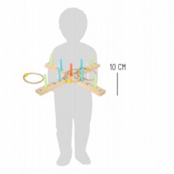 Kes tõestab laskeoskust? Selles puidust sõrmuseviskemängus on eesmärgiks asetada punutud rõngad üheksale erivärvilisele nööpnõelale, mille vastavat punktisummat saab määrata ka ilma numbriteadmisteta. Ideaalne noorematele mängijatele, kes pole veel numbreid õppinud! Mängu on väga lihtne lahti võtta ja uuesti kokku panna ning seda saab liikvel olles hõlpsasti kandekotis hoiustada! Suurepärane mäng, mis tagab kauakestva lõbu, treenib mänguliselt käe-silma koordinatsiooni ja osavust ning kus harjutamine teeb meistriks!