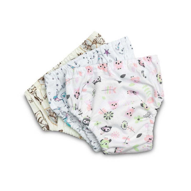 Treeningpüksid teevad puhastamise õppimise lihtsamaks. Seetõttu on need eriti kasulikud desodoreerimise viimases etapis. Need sobivad suurepäraselt ka esimeseks "päris" aluspesuks, aidates õppida iseseisvalt riietuma. Valmistatud pehmest ja hingavast puuvillast. Sees on polüuretaanmembraani kiht, mis vähendab vee läbilaskvust. Komplektide mustrid valitakse juhuslikult vastavalt materjalide saadavusele. Siiski säilitatakse alati jaotus poistele ja tüdrukutele mõeldud komplektideks.