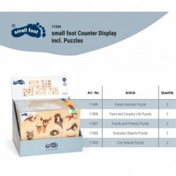 10 puidust puslet, mis on seatud praktilisse letiväljapanekusse metsaloomade, talu- ja maaelu, pere ja sõprade, linnasõidukite ja igapäevaste esemete teemadel. Sobivad, eriti armsalt illustreeritud mõistatused!