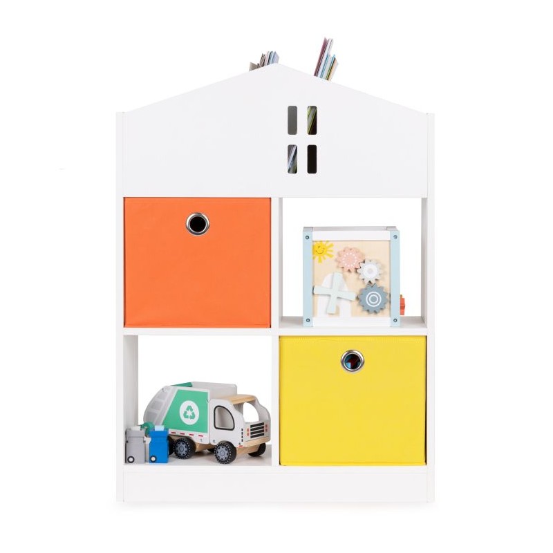 Raamaturiiul, mis on valmistatud vastupidavast puitlaastplaadist ja viimistletud vastupidava spooniga. Sellel on funktsionaalsed riiulid ja värvilised tekstiilist mahutid mänguasjade jaoks. See sobib ideaalselt igat tüüpi interjööri.