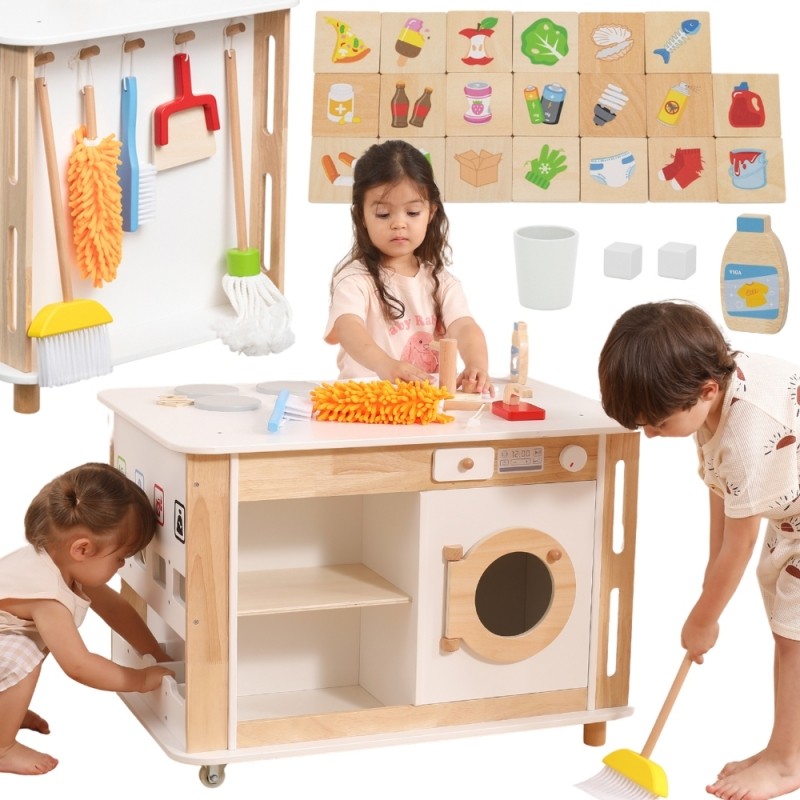 Väikelapsed saavad süüa teha, pesta, koristada ja õppida taaskasutust, mängides läbi realistlikke koduseid stseene. Interaktiivsed elemendid, nagu jäämasin või heliefektidega muruniiduk, muudavad mängu veelgi põnevamaks. Saarekujundus ja arvukad tarvikud soodustavad koostööd ja arendavad sotsiaalseid oskusi. See on ideaalne kingitus lastele vanuses 3 aastat ja vanemad, ühendades igapäevase õppimise loomingulise mänguga!