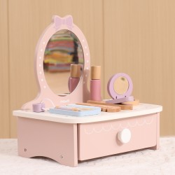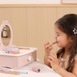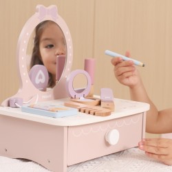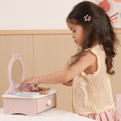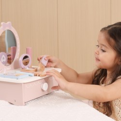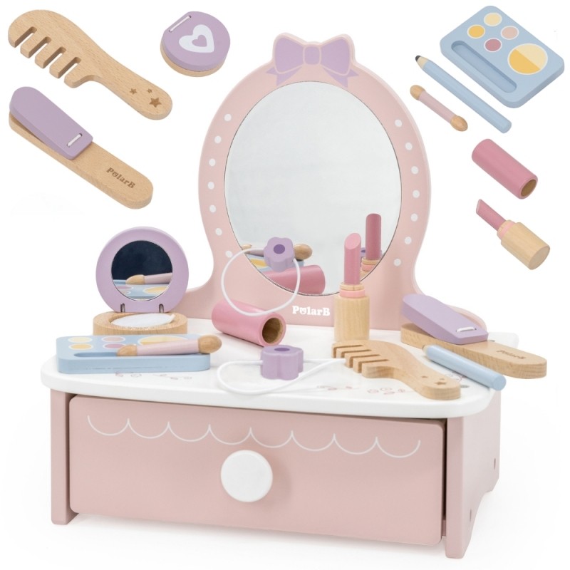 See kaunis Viga puidust tualettlaud on ideaalne mängukomplekt igale tüdrukule, kellele meeldib riietuda, mängida maja või ilusalongis käia. Pastelsetes toonides, turvalise peegli ja arvukate võluvate aksessuaaridega disainitud komplekt pakub teie lapsele palju rõõmu ja hoiab teda tundideks tegevuses. See võluv puidust tualettlaud pole lihtsalt mänguasi – see on värav fantaasia ja loomingulise mängu maailma!