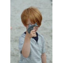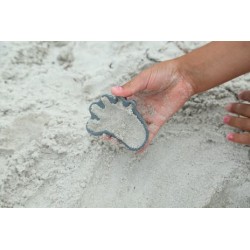 Neli pehmet silikoonist vormi, krabi, rannakarp, delfiin ja jalajälg võrgust kotis.