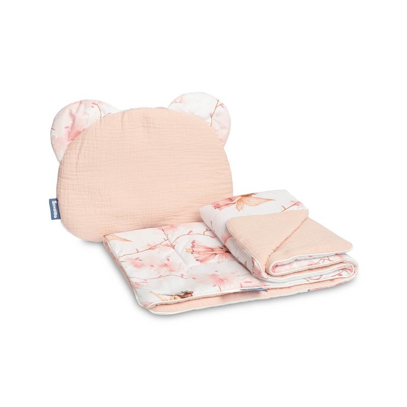Komplekt sisaldab meeldivast musliinist ja puuvillast valmistatud patja ja tekki. Komplekt sobib ideaalselt lapsevankrisse, võrevoodisse või pehmeks matiks teie lapsele. Patja ennast saab kasutada kaisuloomana. Komplekt on valmistatud kahest materjalist - sisemus on 100% puuvilla ja väliskülg pehmest musliinist.