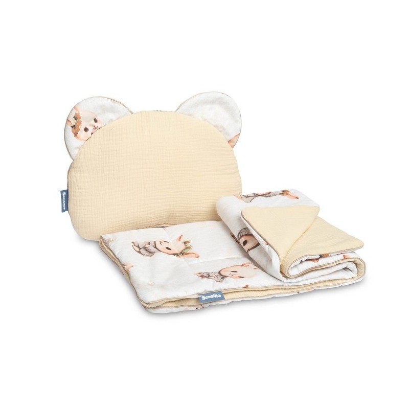 Komplekt sisaldab meeldivast musliinist ja puuvillast valmistatud patja ja tekki. Komplekt sobib ideaalselt lapsevankrisse, võrevoodisse või pehmeks matiks teie lapsele. Patja ennast saab kasutada kaisuloomana. Komplekt on valmistatud kahest materjalist - sisemus on 100% puuvilla ja väliskülg pehmest musliinist.