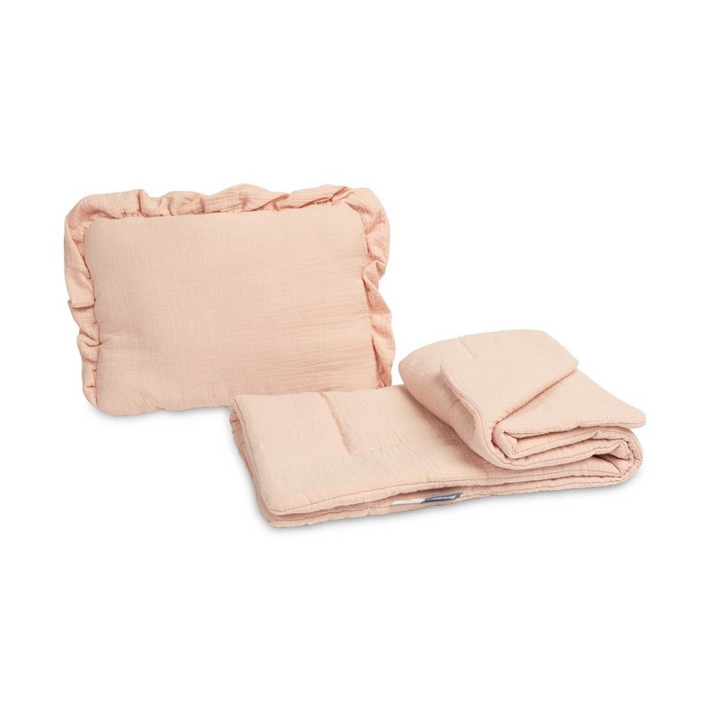 Komplekt sisaldab padja ja tekki, mis on valmistatud meeldivast musliinist. Komplekt sobib ideaalselt lapsevankrisse, võrevoodisse või pehmeks matiks beebile. Patja ennast saab kasutada kaisuloomana. Komplekt on valmistatud kahest materjalist - sisemine külg on 100% puuvill ja välimine kiht on pehme musliin.