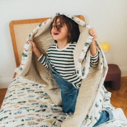 Kahepoolne tekk lasteaeda, mis sobib hästi ka tekiks või mõnusaks katteks lasteaia uinakuajal.  Teki üks pool on valmistatud kõrgeima kvaliteediga puuvillast ühes meie neljast mustrist ja teine ​​pool elegantsest Velvetist. Tekk on täidetud hüpoallergeense silikoonfliisiga, mis muudab selle ülikergeks, pakkudes samas lohutavat soojust.  Tekki saab sobitada sama disainiga padjaga, et luua unikaalne komplekt magamaminekuks või lastetuppa!