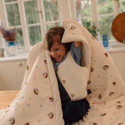 Kahepoolne tekk lasteaeda, mis sobib hästi ka tekiks või mõnusaks katteks lasteaia uinakuajal.  Teki üks pool on valmistatud kõrgeima kvaliteediga puuvillast ühes meie neljast mustrist ja teine ​​pool elegantsest Velvetist. Tekk on täidetud hüpoallergeense silikoonfliisiga, mis muudab selle ülikergeks, pakkudes samas lohutavat soojust.  Tekki saab sobitada sama disainiga padjaga, et luua unikaalne komplekt magamaminekuks või lastetuppa!
